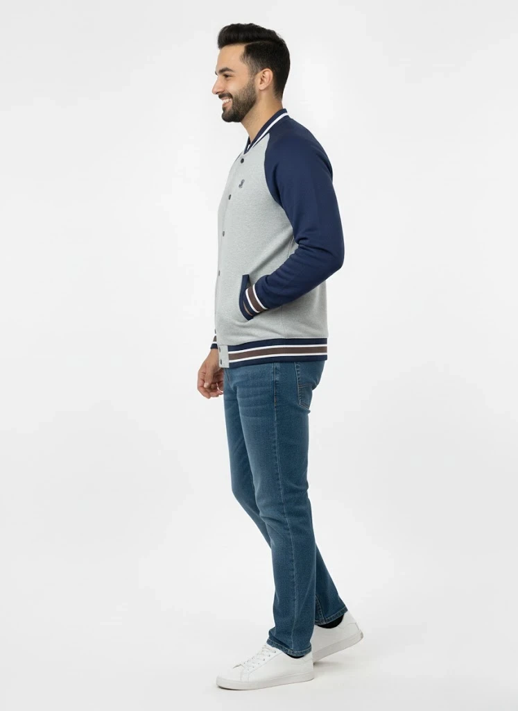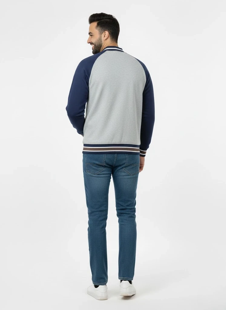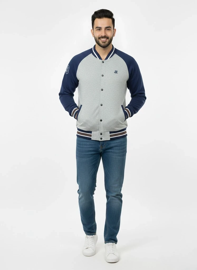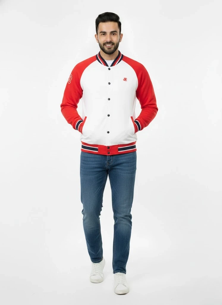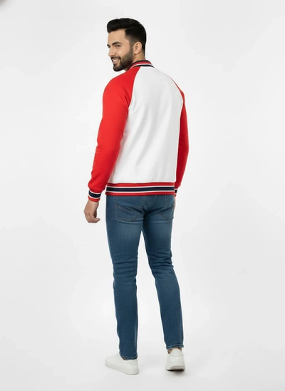 Classic varsity jacket crafted from 280 GSM fleece for warmth and durability. Features a bold red and white color block design with raglan sleeves, snap button closure, and ribbed striped trim. Authentic sporty appeal comes from the embroidered crest and large number detail on the sleeve. Regular fit suits layering. Care: machine wash at 30°C on gentle cycle; avoid bleach, dry cleaning, and tumble drying. Iron at maximum 110°C, never directly on prints or embellishments.