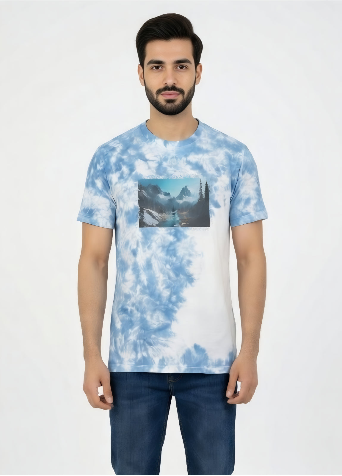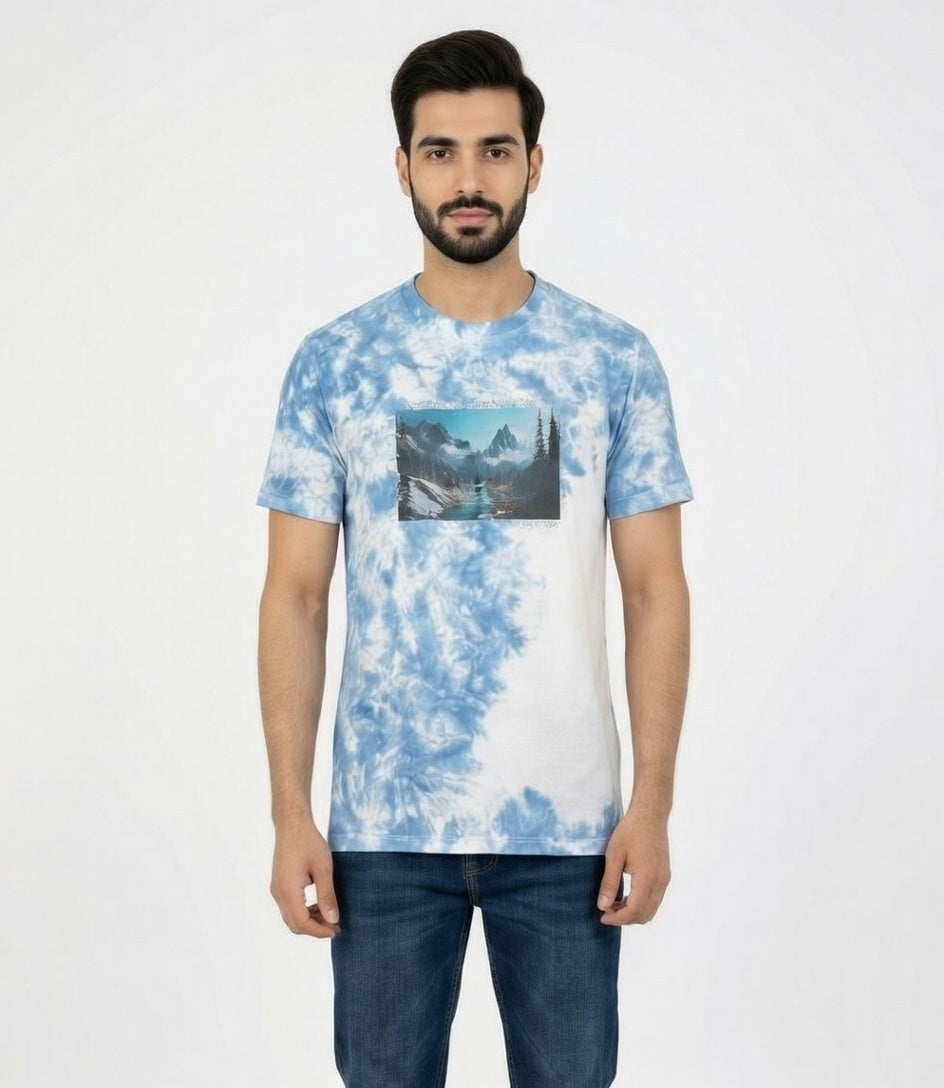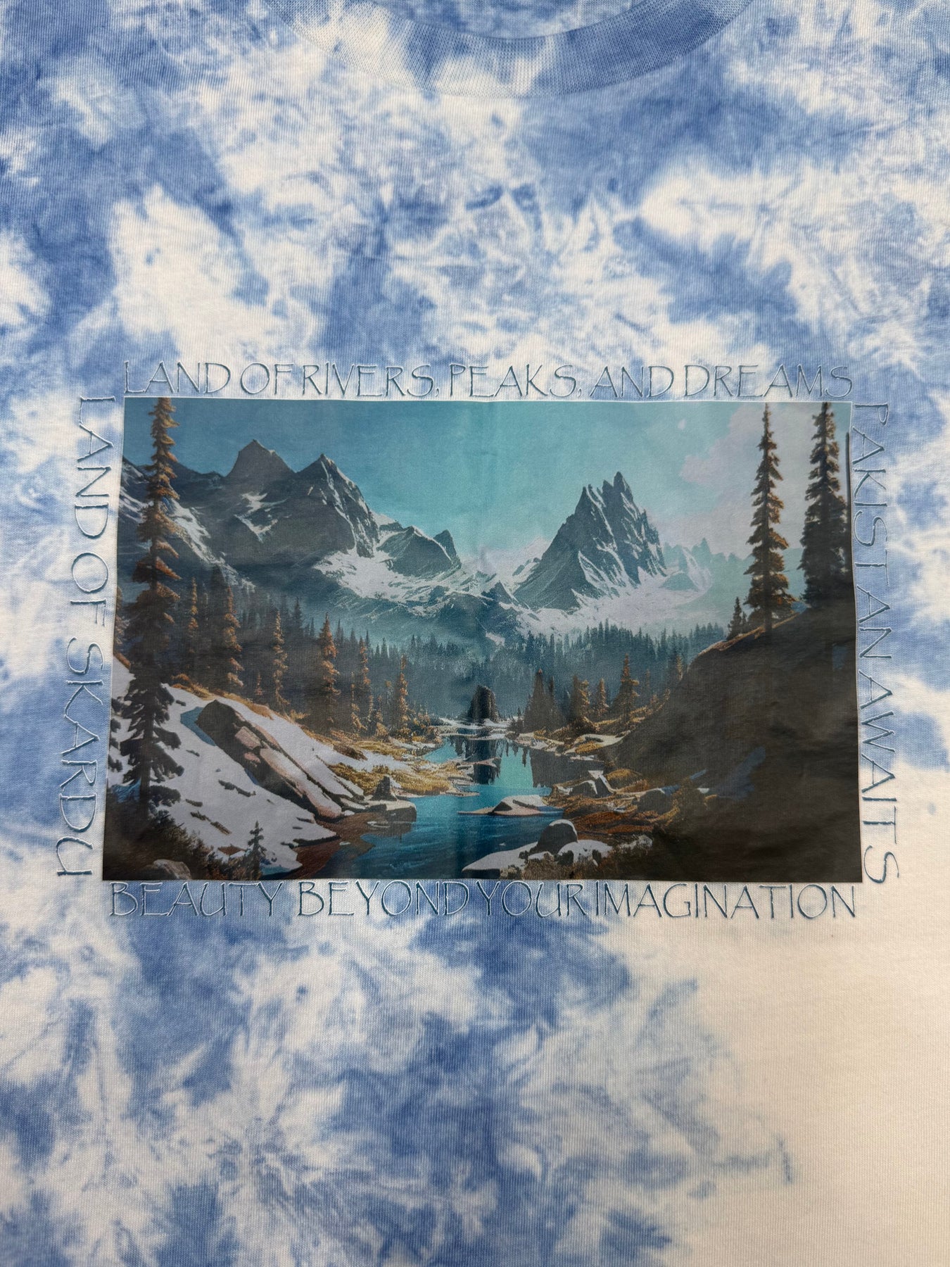 Celebrate Pakistan's breathtaking beauty with the Sweat92 Tie Dye Pakistan T-Shirt — featuring a stunning Skardu-inspired landscape of majestic peaks, serene rivers, and lush valleys on a soft blue-white tie-dye base. Slogan reads and of Rivers, Peaks, and Dreams – Pakistan Awaits – Beauty Beyond Your Imagination.